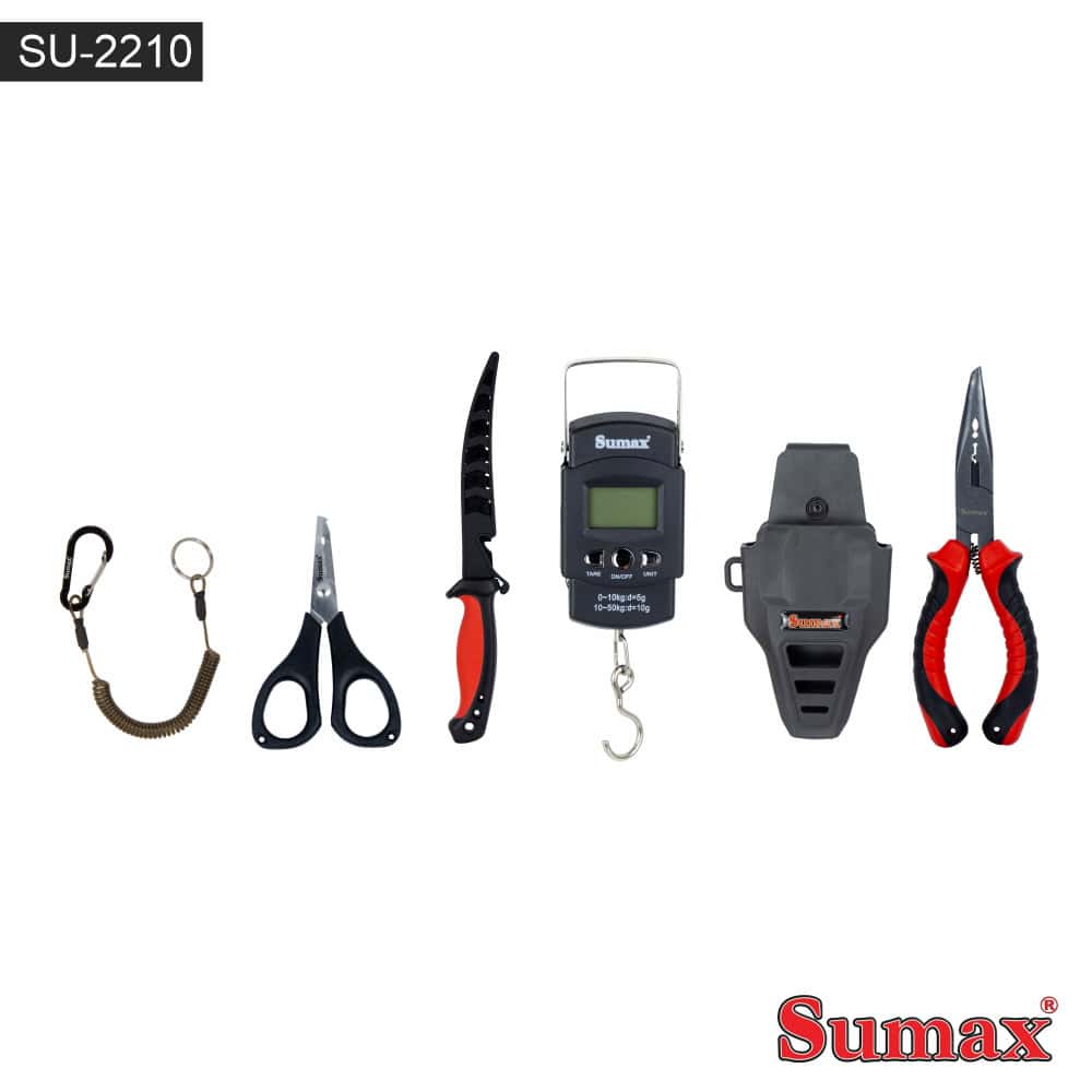 Estuche de accesorios de pesca 5 en 1, viene con alicates de punta, funda para alicates, protector de equipo con mosquetón, cuchillo fileteador con funda protectora, balanza digital y tijeras de pesca.